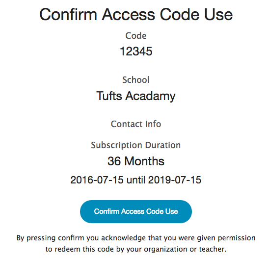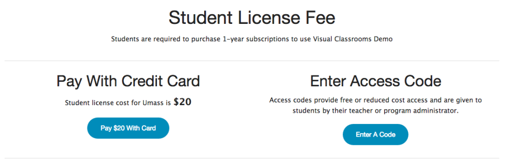 Student accounts require a subscription, as detailed on our pricing page. Many institutions will purchase student subscriptions in bulk and distribute an Access Code that allows students to join Visual Classrooms for free. Students can also purchase a one year subscription with a credit card.