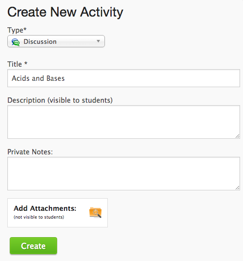 Visual Classrooms gives you the option to create four kinds of activities: Discussions, Homework, Labs, and Quizzes.