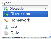 - Select the type of activity you are creating. You can categorize activities as discussions, homework, labs, or quizzes..
