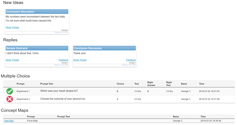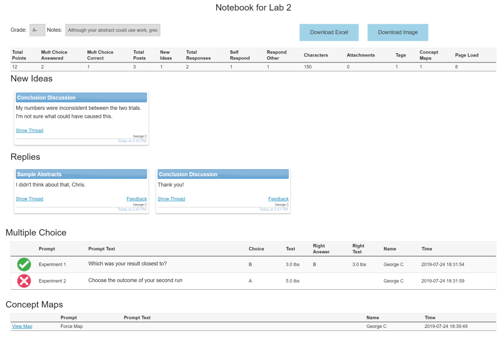 The Student Notebook feature includes all of your answers across all of the prompts in an activity. It also shows your ideas, replies to your ideas, and various statistics about your performance in the activity.