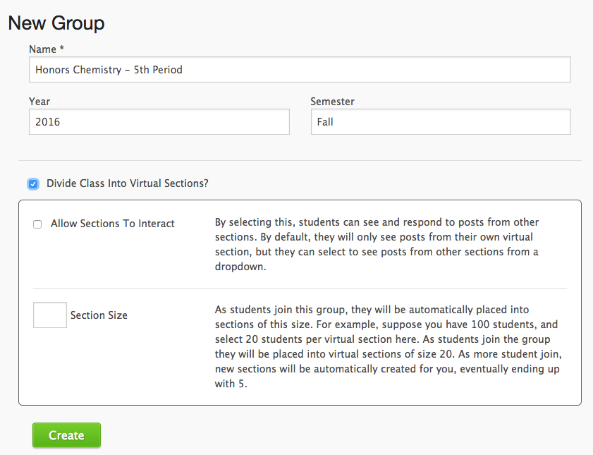 For example, if you have 100 students and set the section size to 20, as students join the group, they will be placed into virtual sections of size 20.
